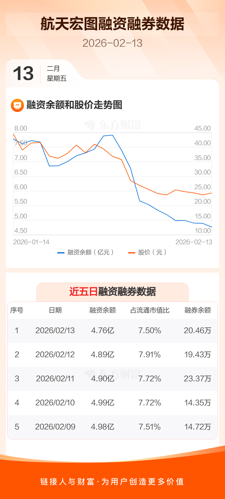 交易所最新数据显示,航天宏图于2026年2月13日获融资买入1595.96万元,融资偿还2945.78万元,当日融资净偿还1349.82万元。目前,该股融资余额4.76亿,占流通市值比例为7.50%。