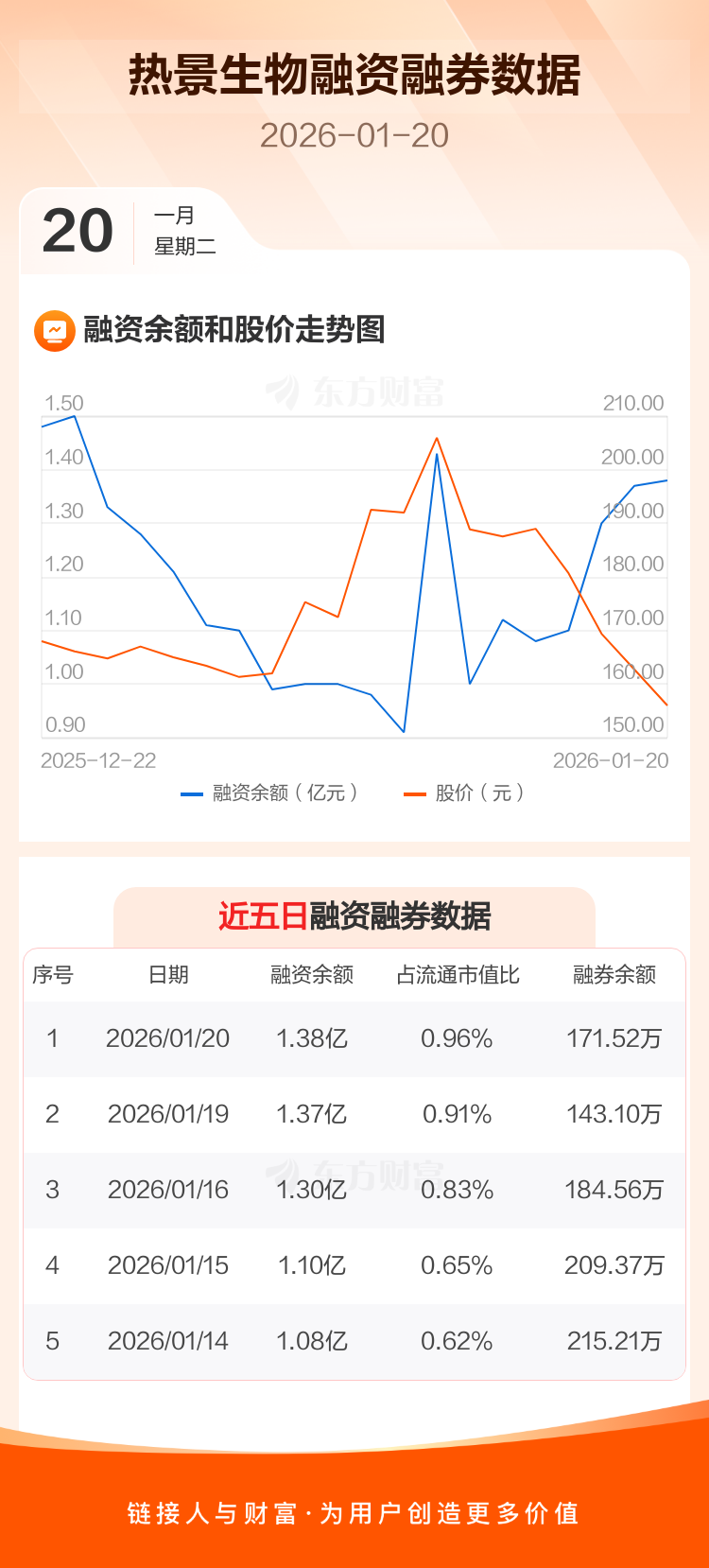交易所最新数据显示,热景生物于2026年1月20日获融资买入1305.15万元,融资偿还1136.27万元,当日融资净买入168.88万元。目前,该股融资余额1.38亿,占流通市值比例为0.96%。