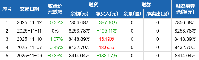 德林海:融资净偿还397.1万元,融资余额7856.68万元(11-12)
