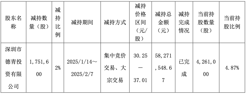 此次减持计划显示,德青投资通过集中竞价交易和大宗交易方式减持不超过1751600股,占公司总股本的2%。减持期间为2025年1月14日至2025年2月7日,减持价格区间为30.25元/股至37.01元/股,减持总金额为58271548.67元。