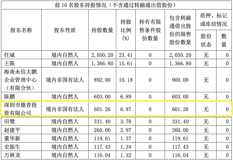减持完成后,德青投资持有公司股份4261000股,占总股本的4.87%。公告称,减持原因是“自身资金需求”,减持股份来源为公司首次公开发行股票并上市前取得的股份。