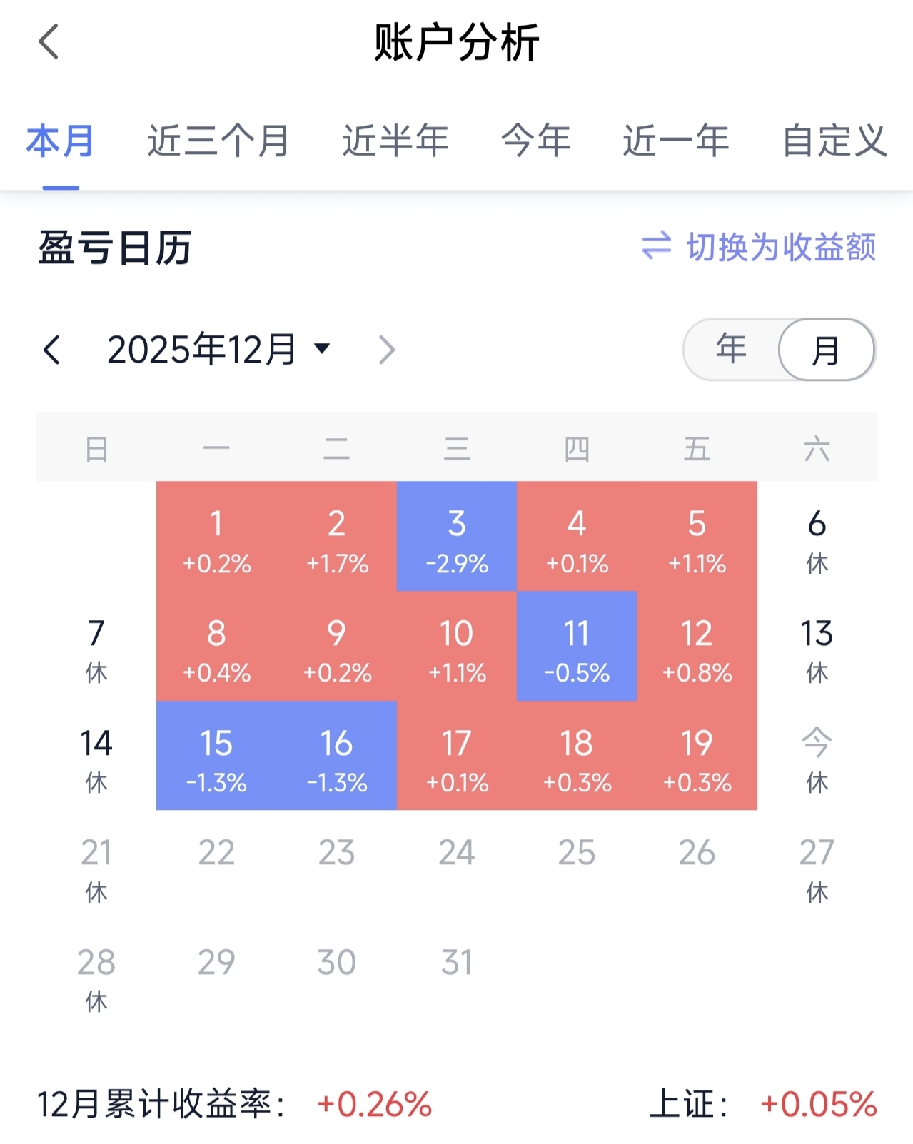 上证涨幅:+0.05%,纵横涨幅:-2.44%,我的涨幅:+0.26%。