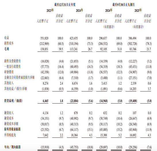 据招股书,2023年、2024年及2025年前九个月(下称“报告期内”),公司营收分别为3.52亿元、4.23亿元、3.86亿元,实现快速增长,而对应期内亏损分别为1591万元、4575.3万元、2925.6万元,其中2024年净利润同比骤降187%。