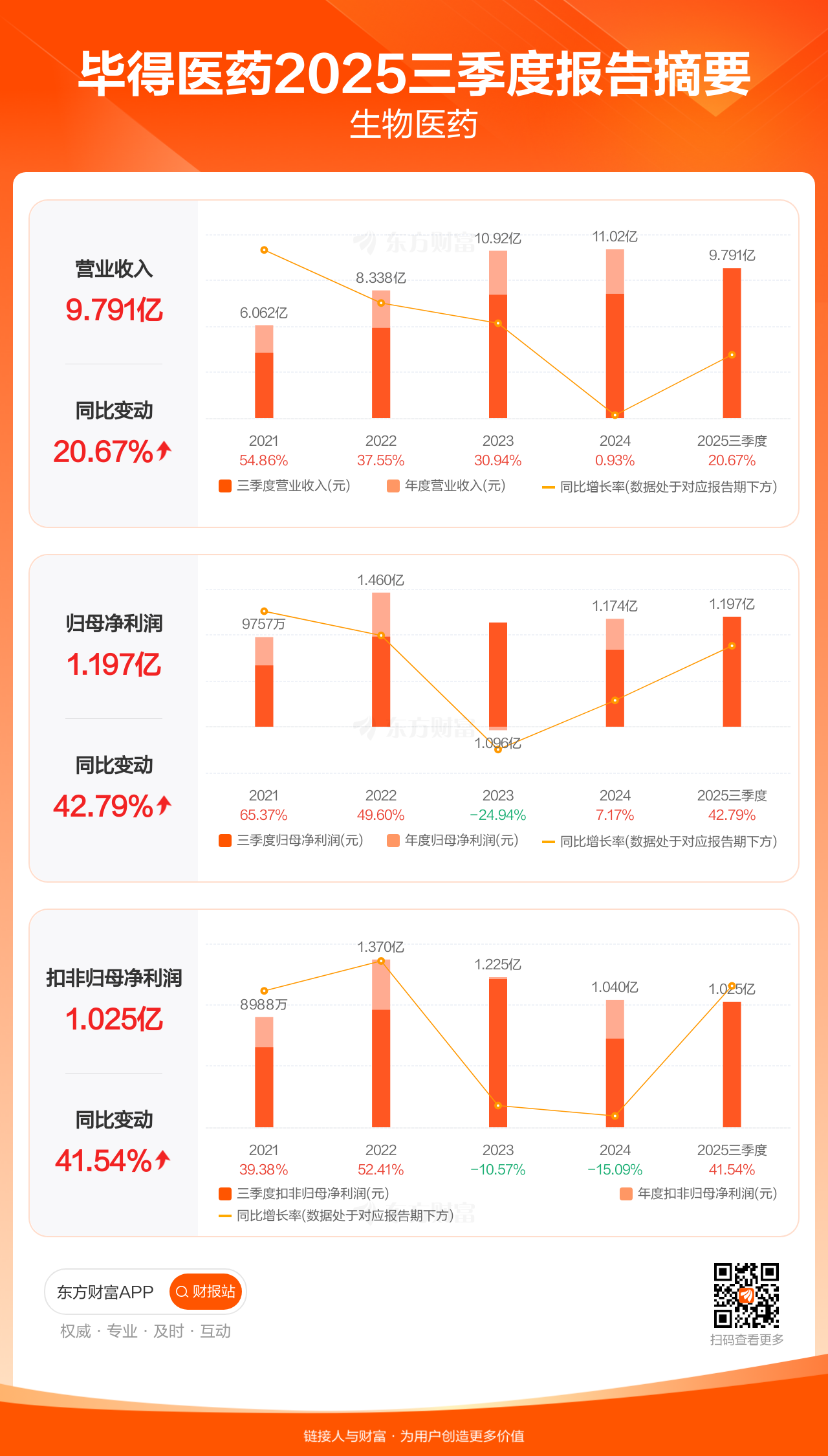 毕得医药10月30日发布2025年三季报显示,公司前三季实现营业收入9.79亿元,同比增长20.67%;归母净利润1.20亿元,同比增长42.79%;扣非归母净利润1.02亿元,同比增长41.54%。
