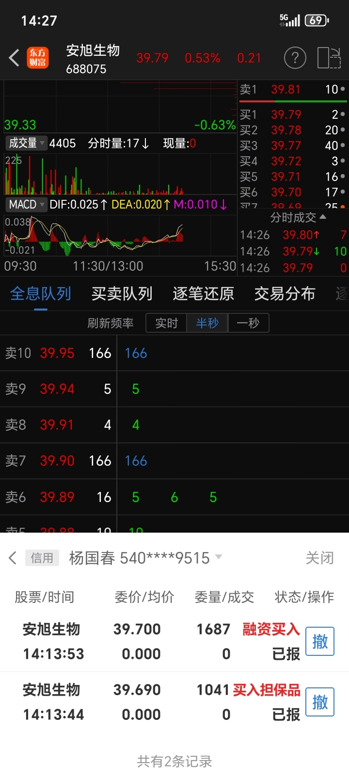 上涨无量,但我下单后就有买单压在我前面。看不懂的安旭!