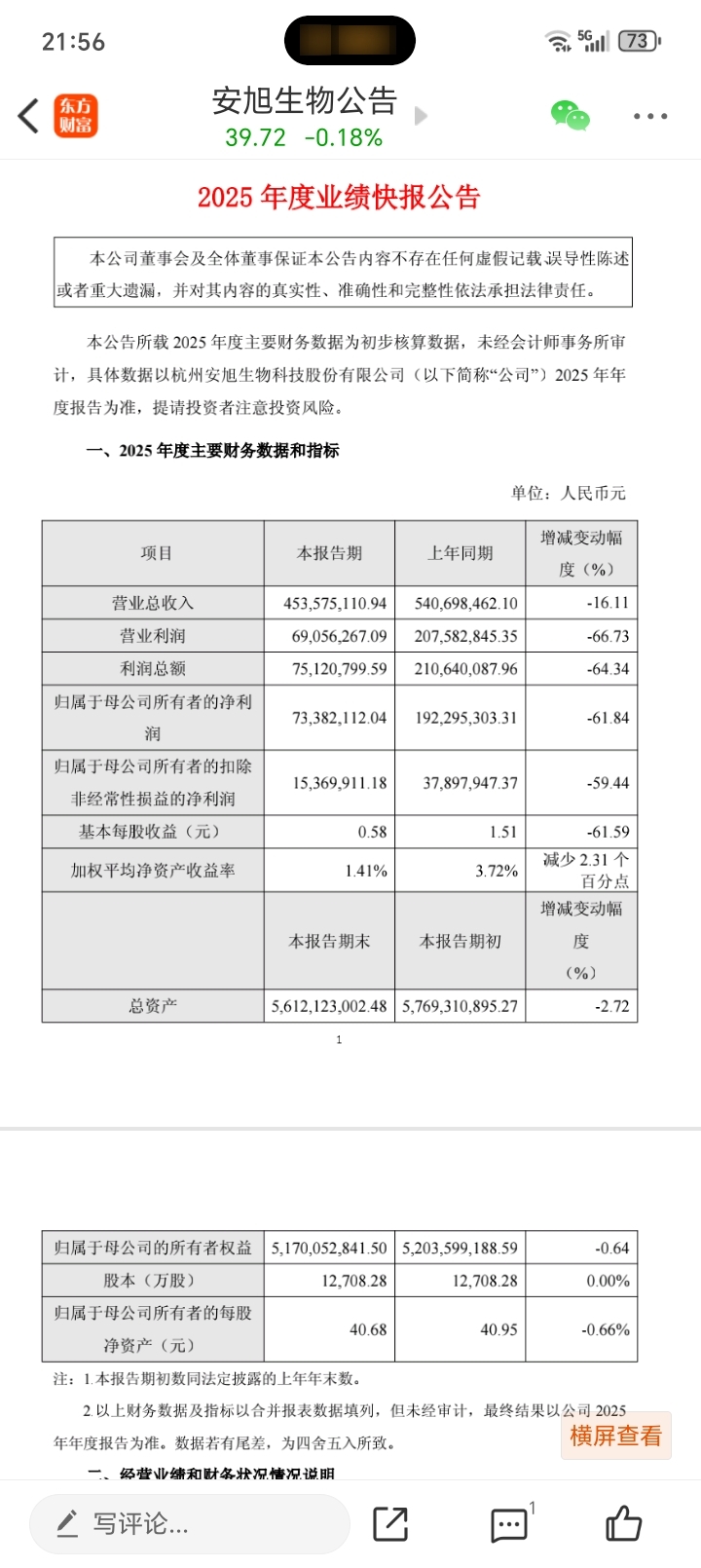 $安旭生物(SH688075)$ 营收下降16%,各项利润,收益下降60%以上,以前4季度是收益大季,本4季仅千余万,在控制?