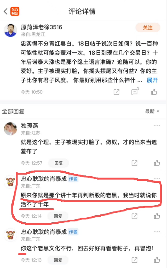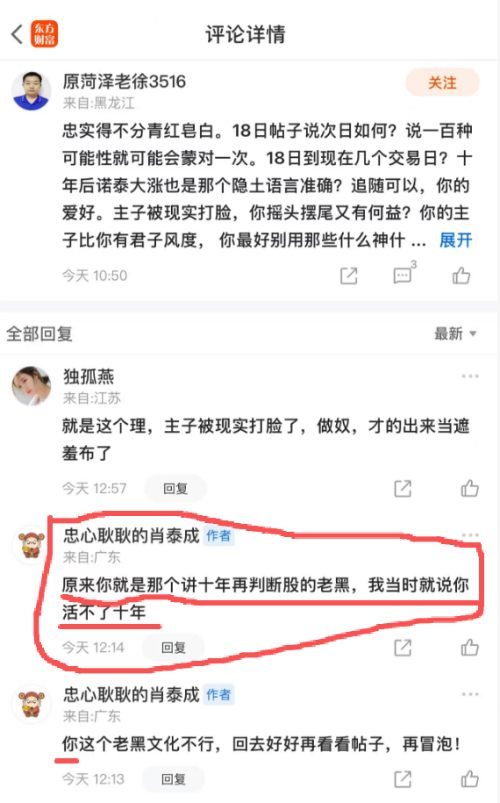 在东财诺泰股吧这片本应理性交流的公共空间里,一个自称“独孤燕”的用户,以恶意“唱空”为能事,如狂犬般追咬任何持不同意见者,污言秽语充斥屏幕——“跟着你的佛山爹爹挣钱了?”“为娘我”等不堪入耳的辱骂不绝于耳。其气焰嚣张至极,公然叫板“你们去告我呀”,俨然一副“老子天下第一”的跋扈姿态。