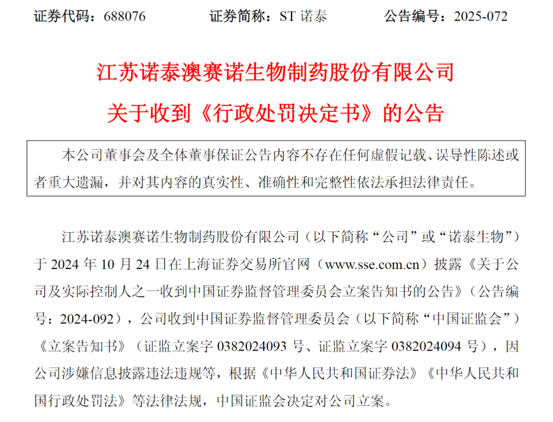 12月17日晚,ST诺泰公告称,公司于近日收到中国证监会下发的《行政处罚决定书》,因存在公开发行文件编造重大虚假内容等违法行为,公司及实际控制人赵德中等6人合计被中国证监会处以7620万元罚款。