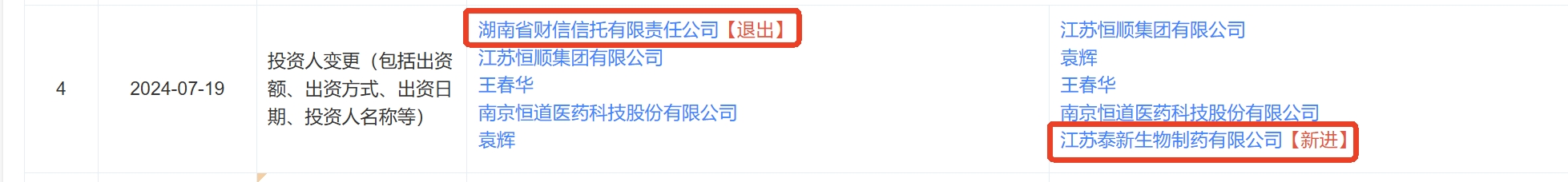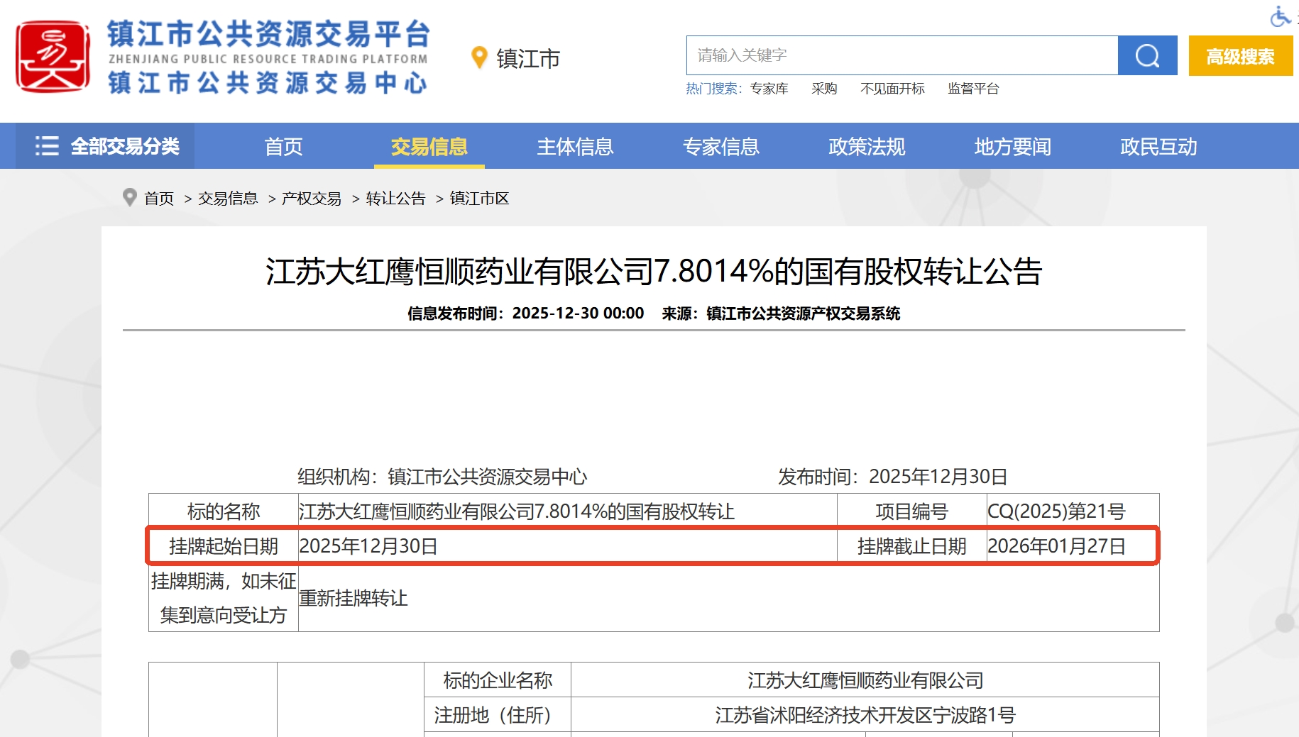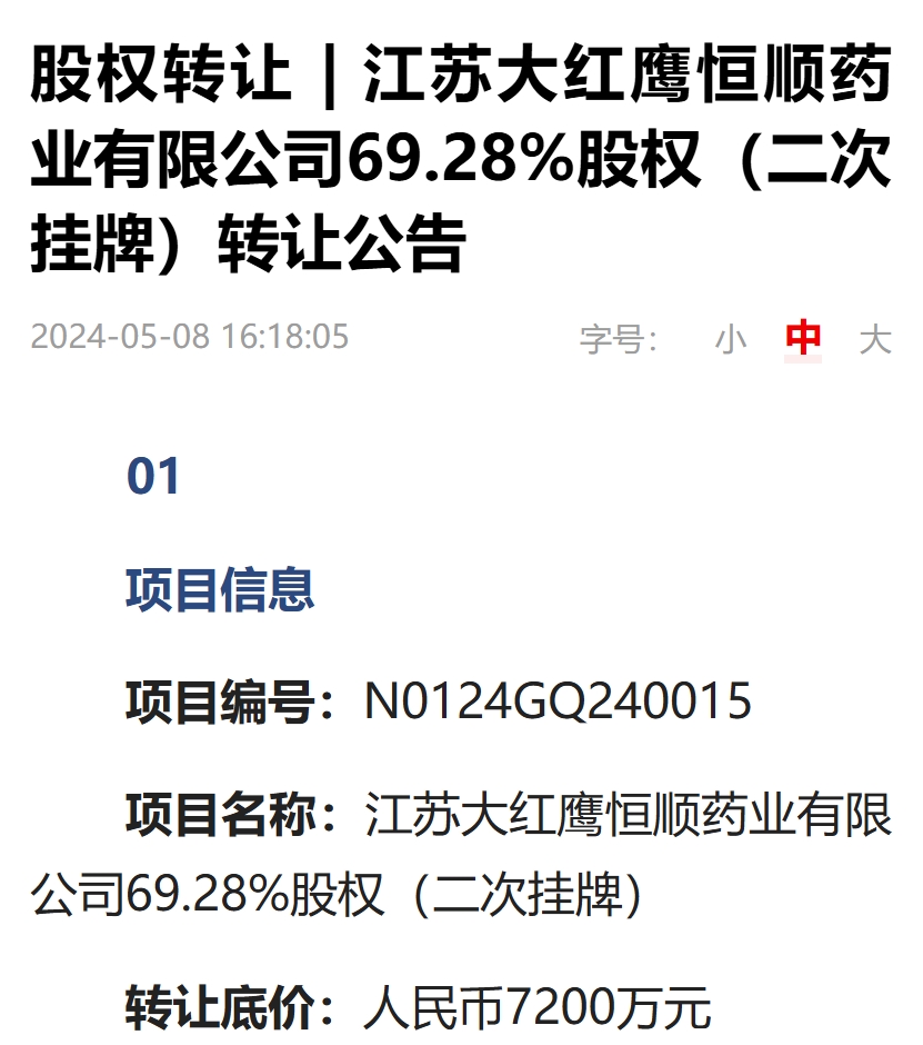 1、江苏大红鹰恒顺药业有限公司股份控股权变更信息: