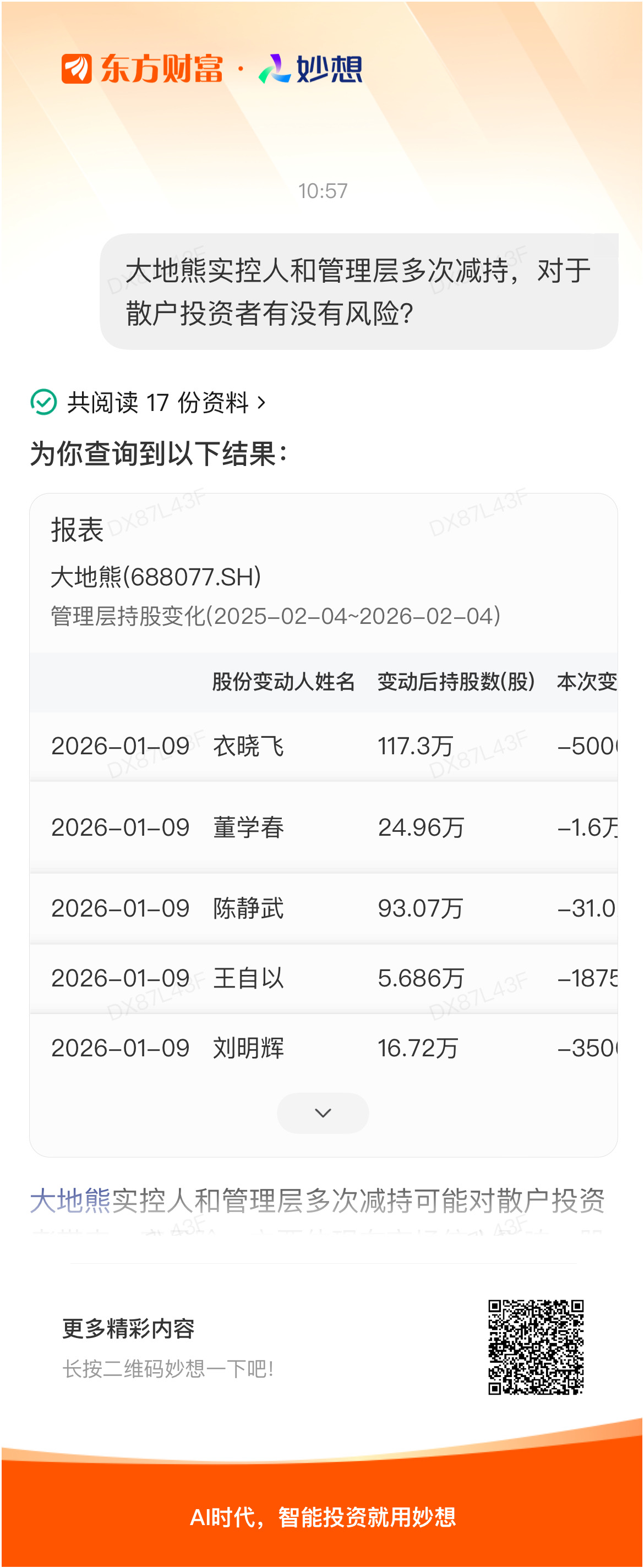 #@妙想,你怎么看?# $大地熊(SH688077)$ 妙想一下:大地熊实控人和管理层多次减持,对于散户投资者有没有风险?