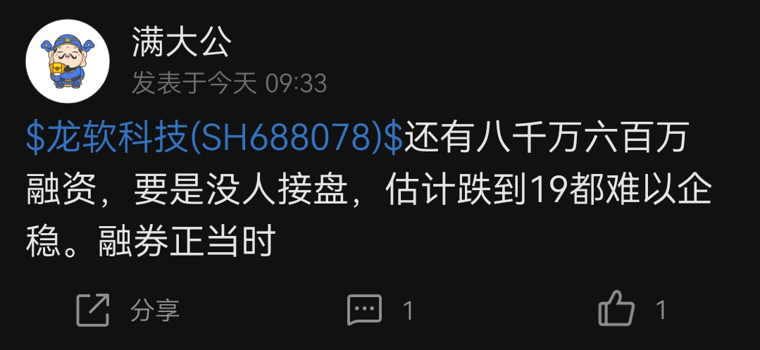 $龙软科技(SH688078)$ 某人融券作空,天天在这儿发帖唱空,不家不要上当,就算不买也别割肉,认清趋势,让空狗爆仓