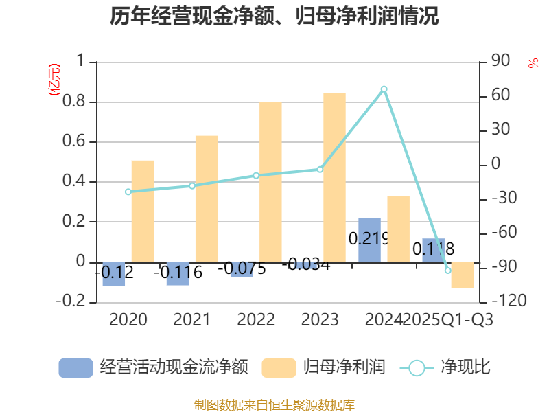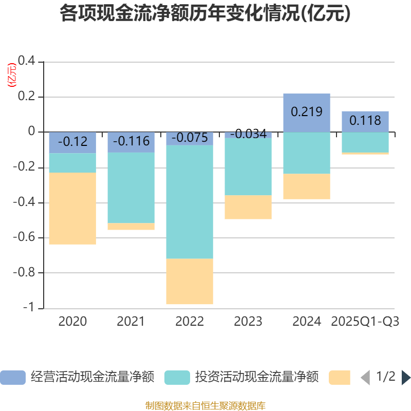 2025年前三季度,公司经营活动现金流净额为1181.82万元,同比增加2978.84万元;筹资活动现金流净额-108.98万元,同比增加1029.79万元;投资活动现金流净额-1156.21万元,上年同期为2340.85万元。