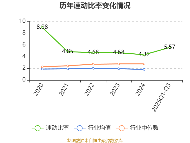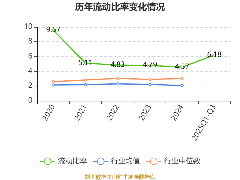 2025年前三季度,公司流动比率为6.18,速动比率为5.57。