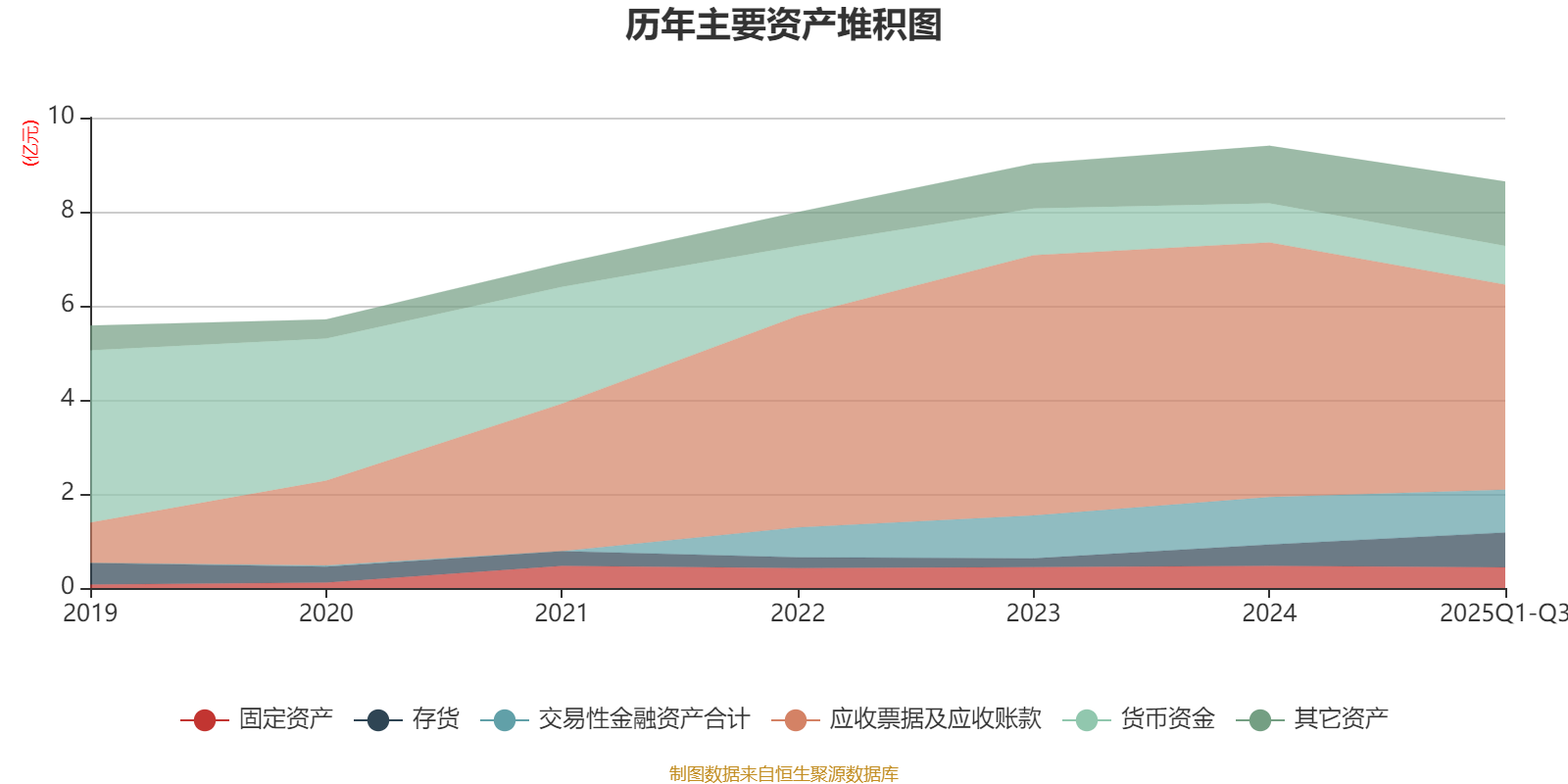 资产重大变化方面,截至2025年三季度末,公司应收票据及应收账款较上年末减少19.46%,占公司总资产比重下降7.13个百分点;存货较上年末增加63.88%,占公司总资产比重上升3.76个百分点;其他非流动资产较上年末增加327.4%,占公司总资产比重上升2.04个百分点;货币资金较上年末减少1%,占公司总资产比重上升0.68个百分点。