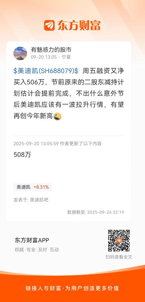 $美迪凯(SH688079)$ 周五融资又净买入506万,节前原来的二股东减持计划估计会提前完成,不出什么意外节后美迪凯应该有一波拉升行情,有望再创今年新高