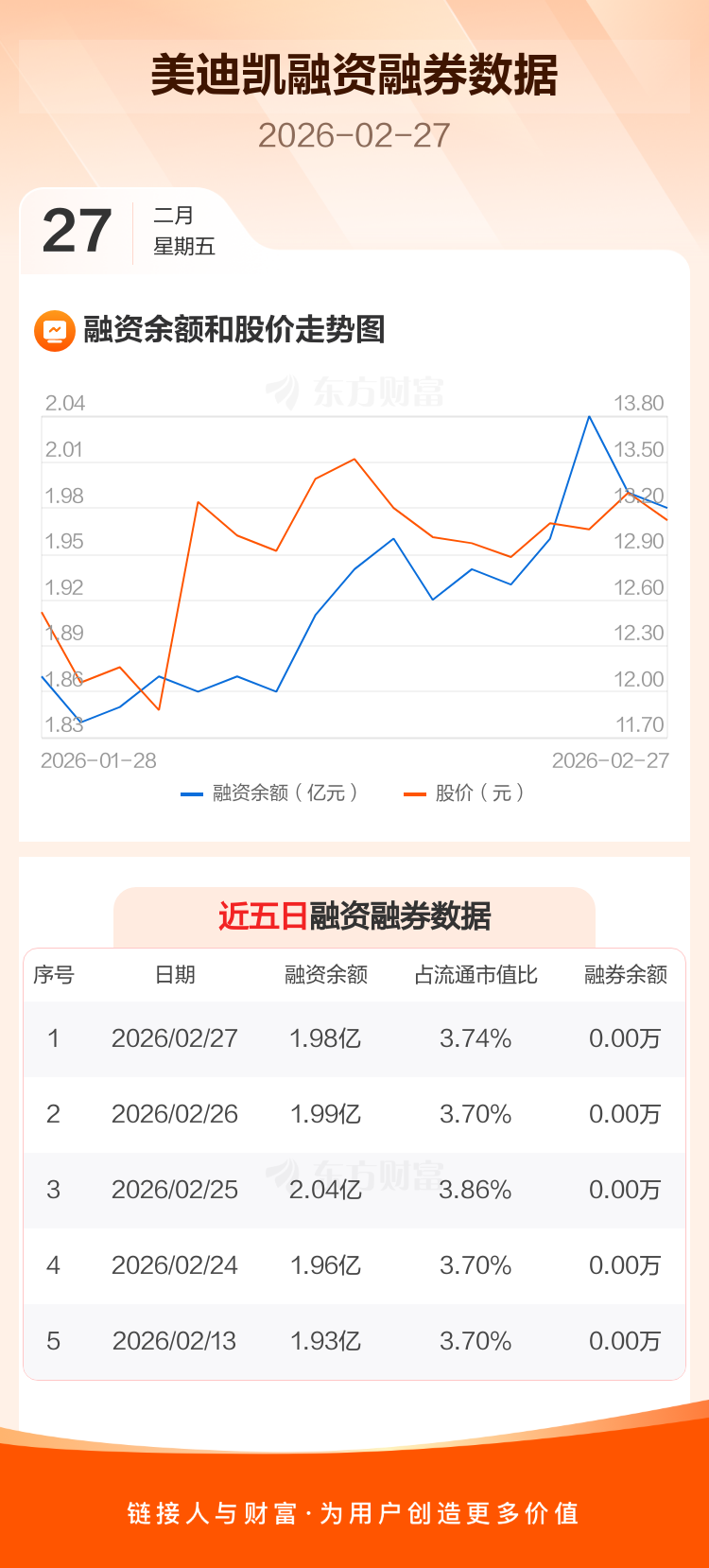 交易所最新数据显示,美迪凯于2026年2月27日获融资买入668.97万元,融资偿还759.47万元,当日融资净偿还90.49万元。目前,该股融资余额1.98亿,占流通市值比例为3.74%。