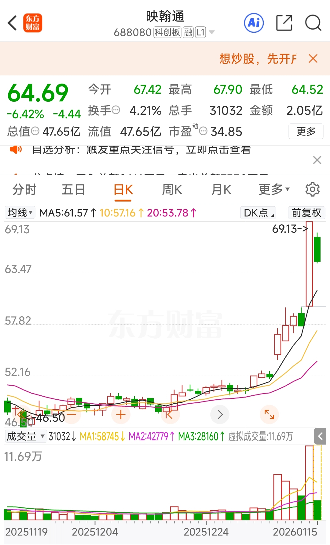 $映翰通(SH688080)$ Ai智能体+机器人+工业互联+车联网+智能电网+5G+边缘计算+跨境电商,突破64元回踩确认,绿盘买入。2025三季报净利润1亿元增23%,每股收益1.39元,2025每股收益2.25元