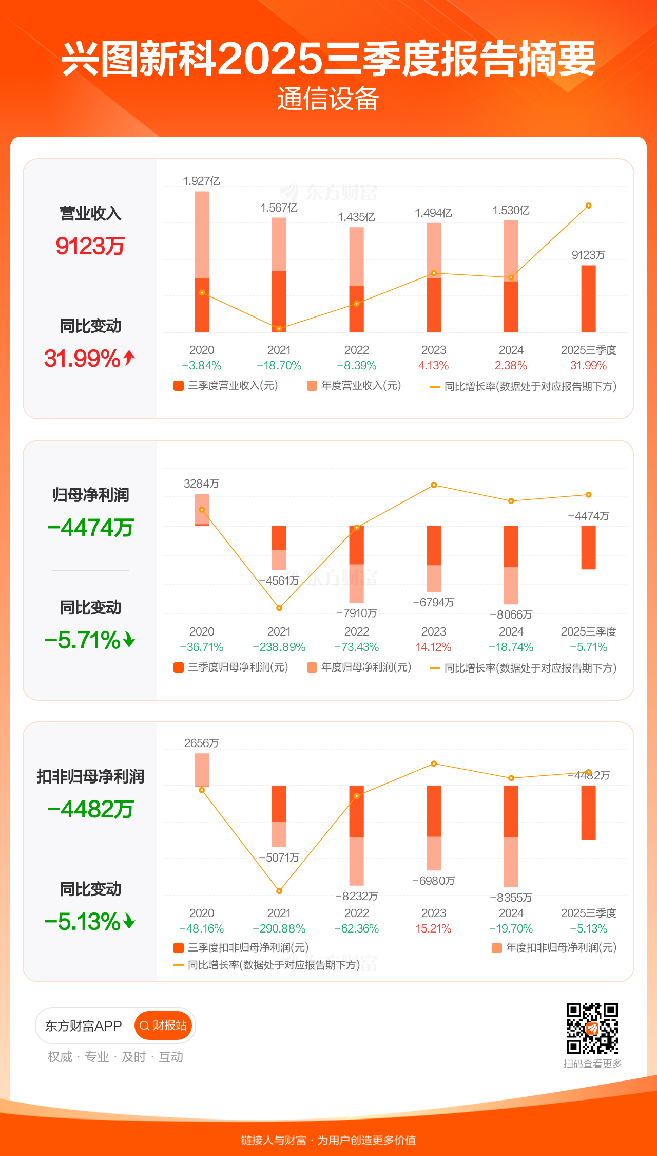 兴图新科10月31日发布2025年三季报显示,公司前三季实现营业收入9122.96万元,同比增长31.99%;归母净利润-4474.14万元;扣非归母净利润-4482.30万元。