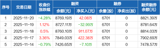 晶品特装:融资净买入42.08万元,融资余额8769.19万元(11-20)