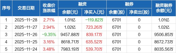 晶品特装:融资净偿还119.82万元,融资余额1.01亿元(11-28)