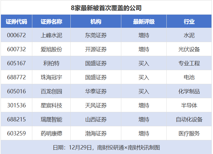 首次覆盖方面,12月29日券商共给出了8次首次覆盖,其中上峰水泥获得东莞证券给予“增持”评级,爱旭股份获得开源证券给予“增持”评级,利柏特、珠海冠宇获得国盛证券给予“买入”评级,百龙创园获得华泰证券给予“买入”评级。
