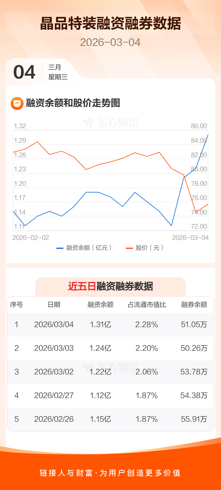 交易所最新数据显示,晶品特装于2026年3月4日获融资买入1985.90万元,融资偿还1340.59万元,当日融资净买入645.31万元。目前,该股融资余额1.31亿,占流通市值比例为2.28%。
