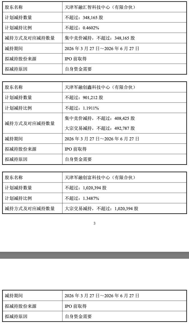 3月5日,晶品特装(688084)公告,股东军融汇智、军融创鑫和军融创富计划自本公告披露之日起15个交易日后的3个月内,合计减持公司股份不超过226.98万股,占公司总股本的3.00%。