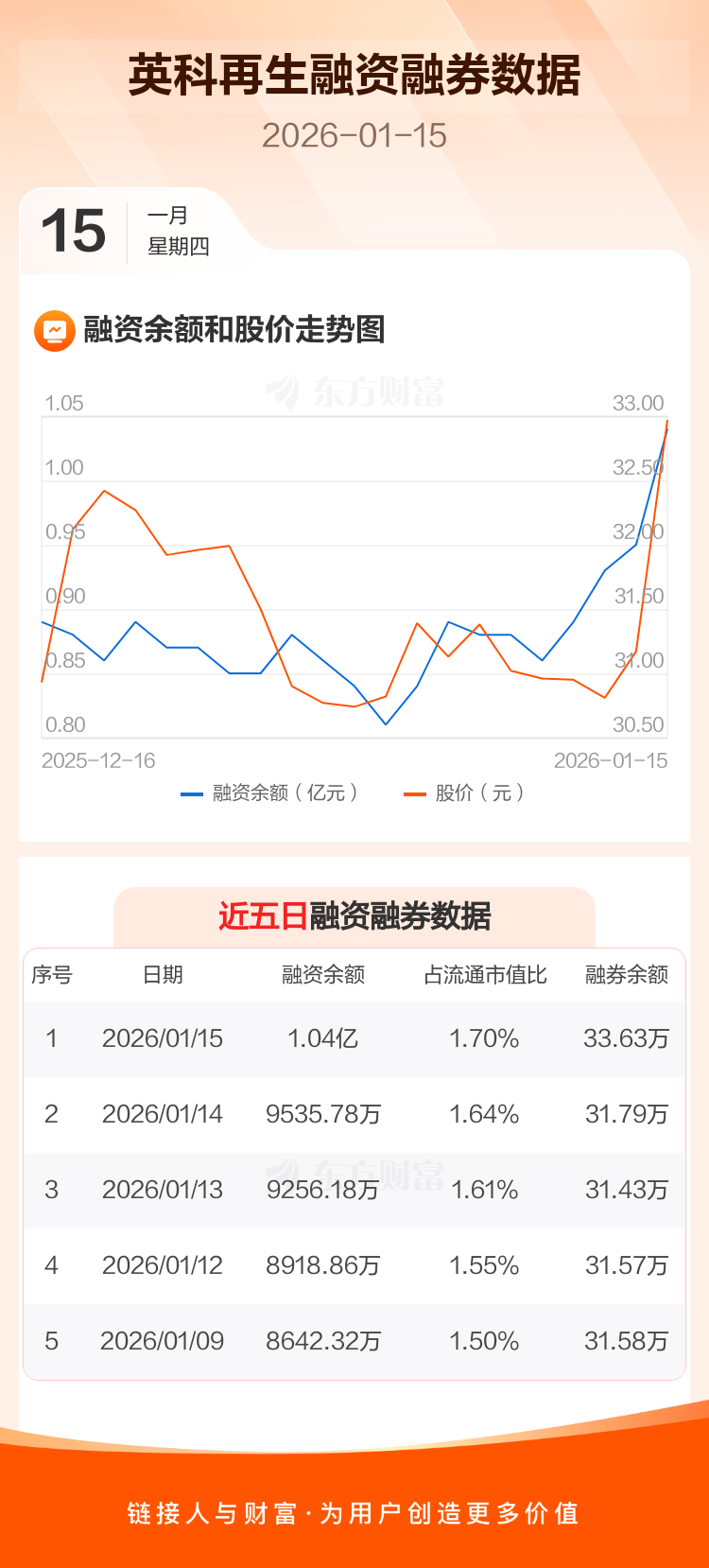 交易所最新数据显示,英科再生于2026年1月15日获融资买入1722.51万元,融资偿还823.05万元,当日融资净买入899.46万元。目前,该股融资余额1.04亿,占流通市值比例为1.70%。