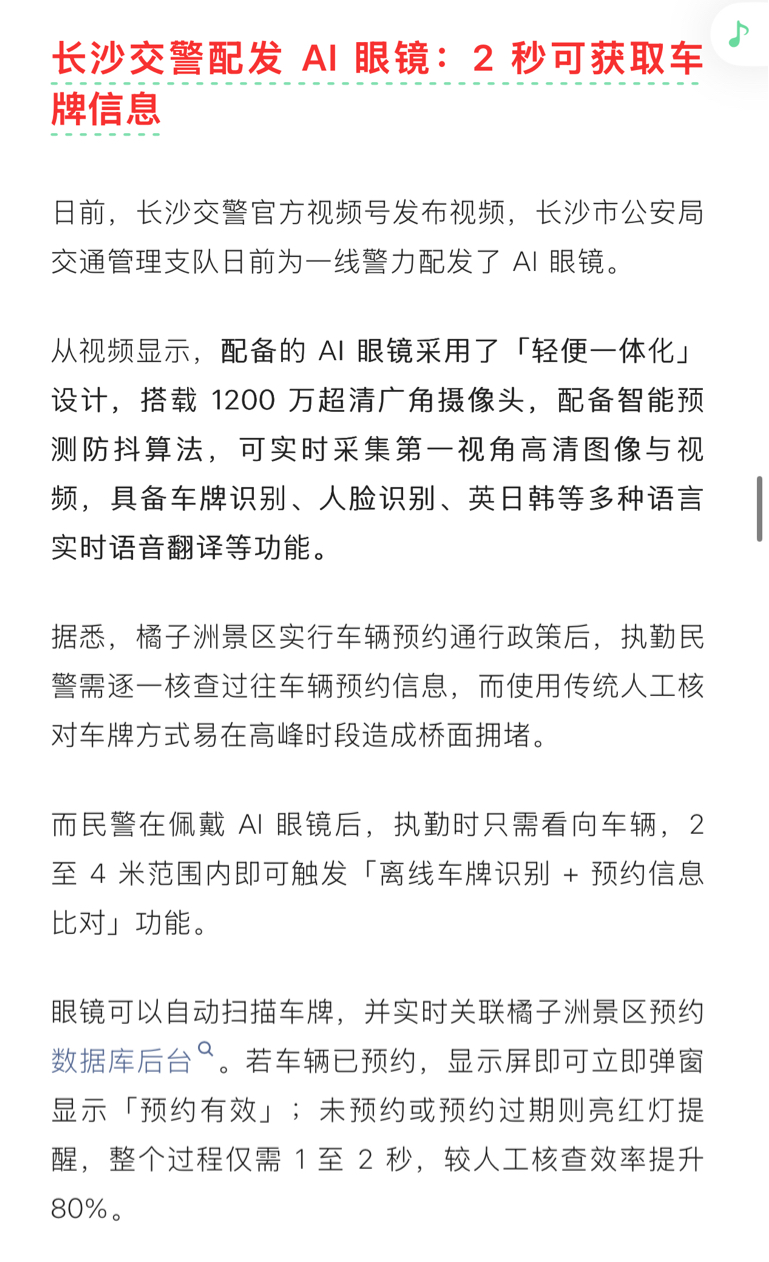 $虹软科技(SH688088)$ $当虹科技(SH688039)$ 长沙交警配置 AI智能眼镜!示范作用,其他地区的交警跟进!对虹软科技大利好!
