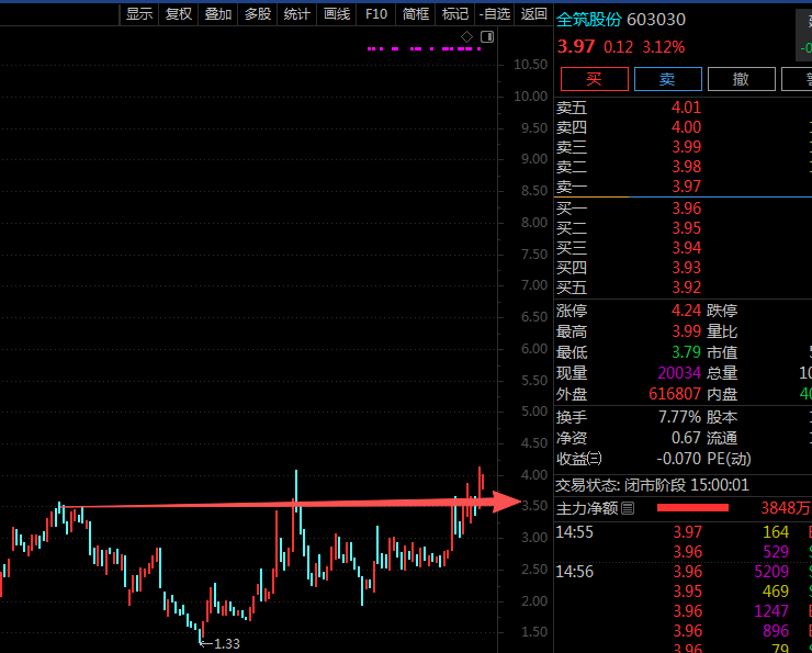 全筑股份:下图是一个周线图,从图中大家都能看到它是形成了大平台的突破,从日K上来看涨停后基本在一条线上横盘,换句话来说前面的套牢盘该走的都走了,打板短线客也早就走了,直接横盘都快半个月了,这谁能熬得住,昨天在情绪比较弱的情况下,全筑主动放量这里是蠢蠢欲动,可能是要加速向上了,这里可以找个合适的低吸机会干进去,防守位置就定在3.8就可以了,进可攻退可守,如果有兄弟感觉自己把握不好的小关点好,留言区随时等文哥讯息。