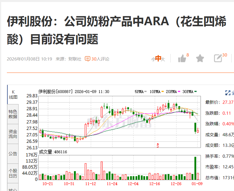 伊利股份 公司奶粉产品中ARA目前没有问题