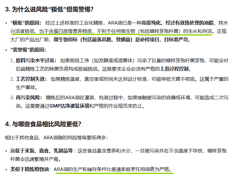 ARA油脂极其不利于微生物生长。储存条件也很严格。这种概率太低了。而且雀巢说可能