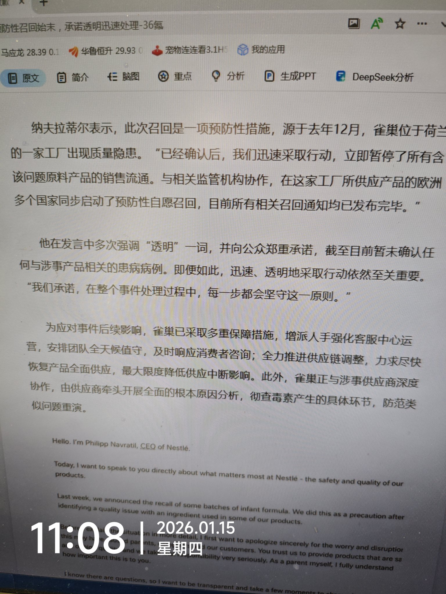 $嘉必优(SH688089)$ 雀巢CEO昨天公开道歉,这是其中内容的一段话。有几点值得注意,第一,透明,说明雀巢要把这件事彻头彻尾搞清楚,不会不了了之。第二,强调供应链调整,说明雀巢供应链存在问题,第三,与涉事供应商深度协作,全面彻查,第四,防范类似问题重演。第四点很值得玩味,究竟是继续合作呢?还是不合作呢?