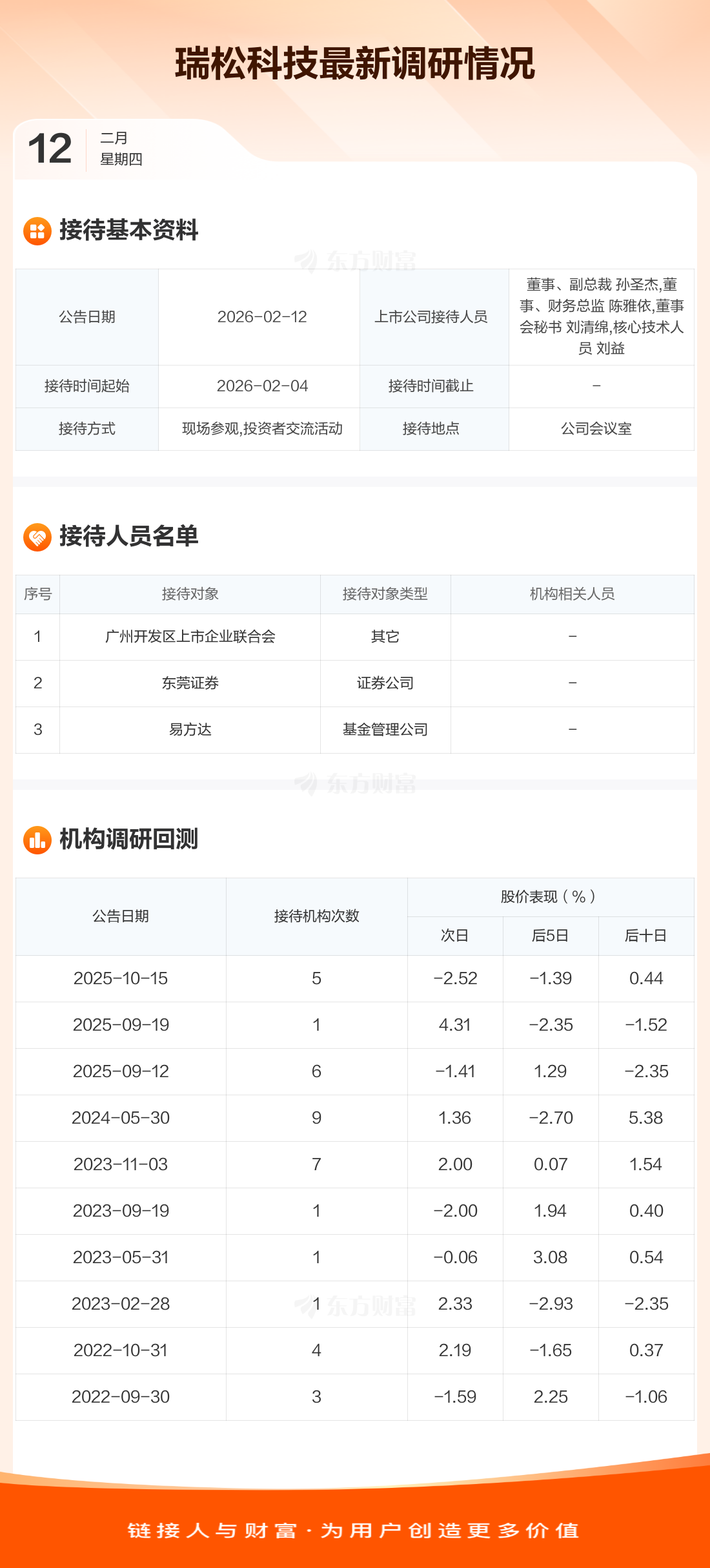 瑞松科技2月12日公告称,2月4日接待广州开发区上市企业联合会等3家机构调研。接待人员包括董事、副总裁 孙圣杰,董事、财务总监 陈雅依,董事会秘书 刘清绵,核心技术人员 刘益。