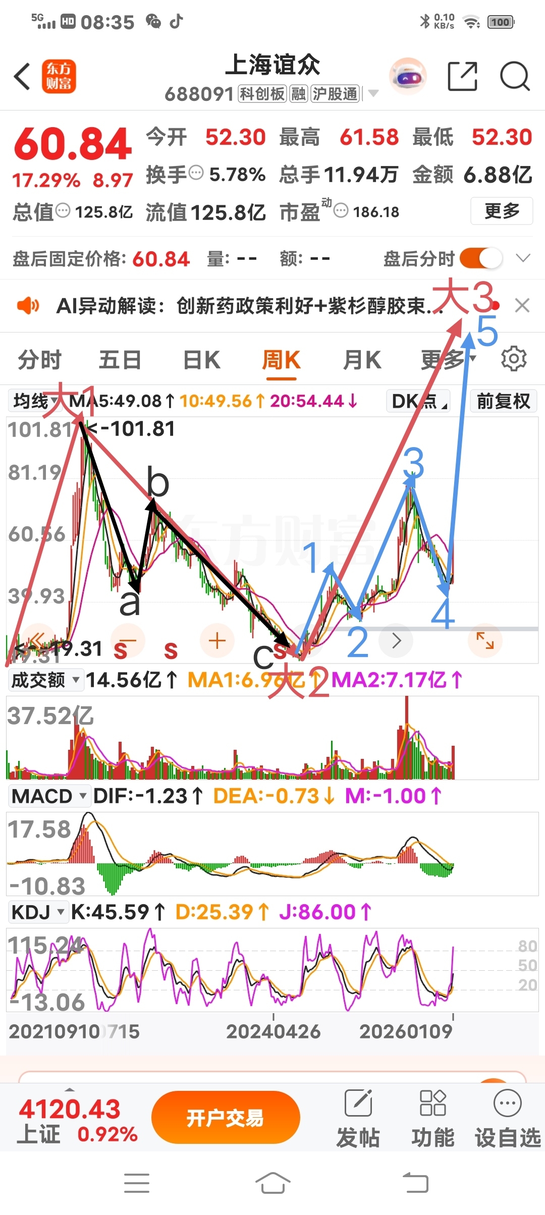 2024.11.13见1浪上升高点53.18元,涨幅163%,随后运行2浪下跌,2025.02.18见低点33.34元,接着运行3浪上升,2025.08.19见高点83.60元,涨幅151%,之后运行4浪下跌,2025.12.17见低点42.42元,近期股价放量大涨且60日均线有向上翘头迹象,判断为5浪上升已在路上。
