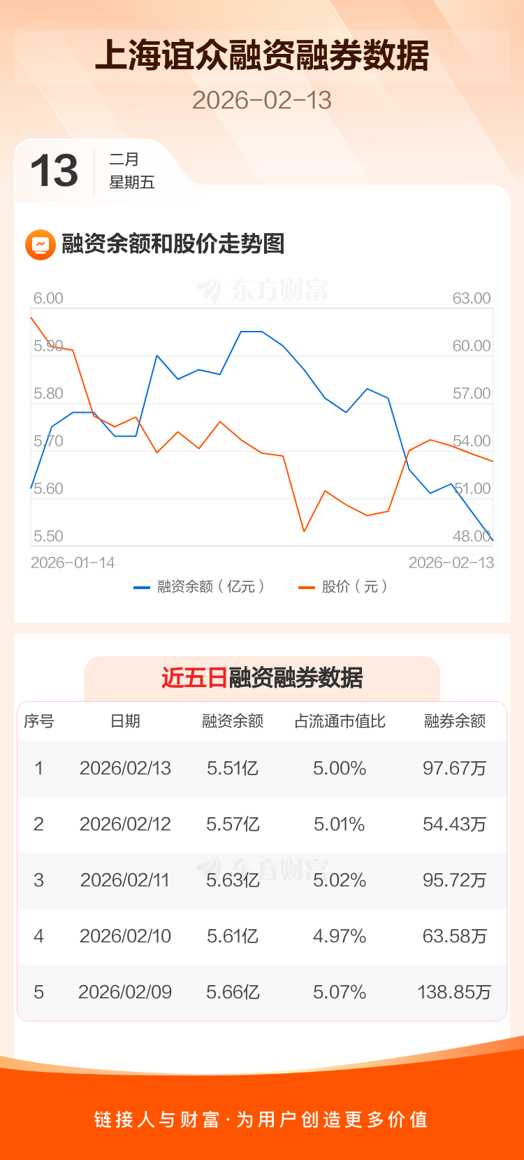 交易所最新数据显示,上海谊众于2026年2月13日获融资买入504.95万元,融资偿还1085.41万元,当日融资净偿还580.46万元。目前,该股融资余额5.51亿,占流通市值比例为5.00%。
