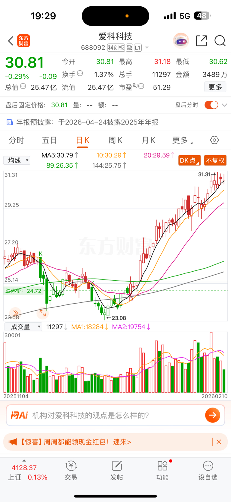 $爱科科技(SH688092)$ AK近期在30阵地上已反复整理五天时间,五天线继续有效。审美疲劳阶段显现围城现象特征,成交量日趋萎缩且不为大盘所左右,其走势良好、健康。