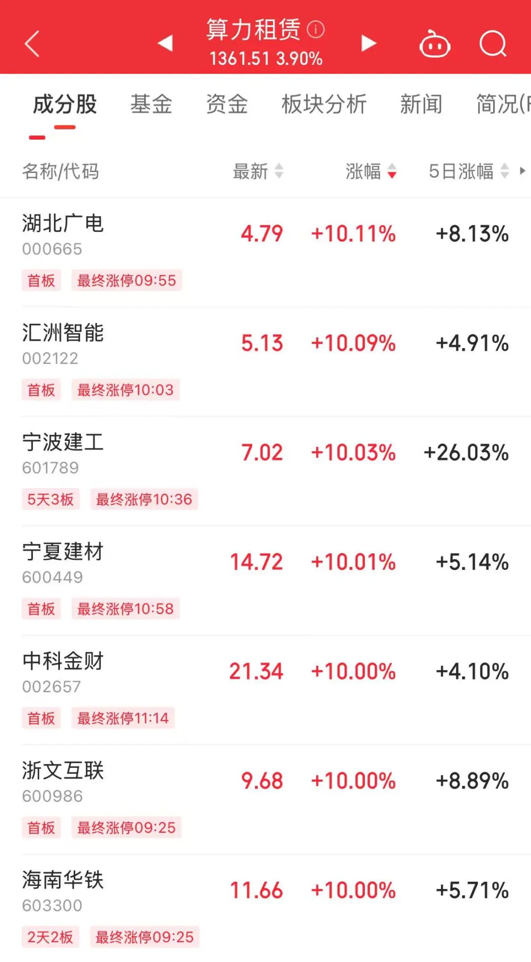 早盘算力板块行情继续呈现扩散迹象,湖北广电、宁波建工、南兴股份等多只个股涨停;昨日涨停的拓维信息大幅上扬,盘中触及涨停。