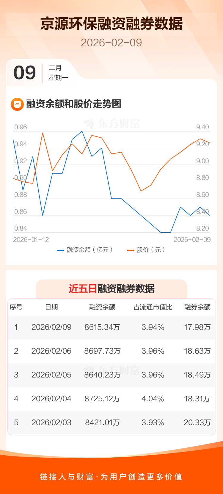 交易所最新数据显示,京源环保于2026年2月9日获融资买入160.69万元,融资偿还243.08万元,当日融资净偿还82.39万元。目前,该股融资余额8615.34万,占流通市值比例为3.94%。