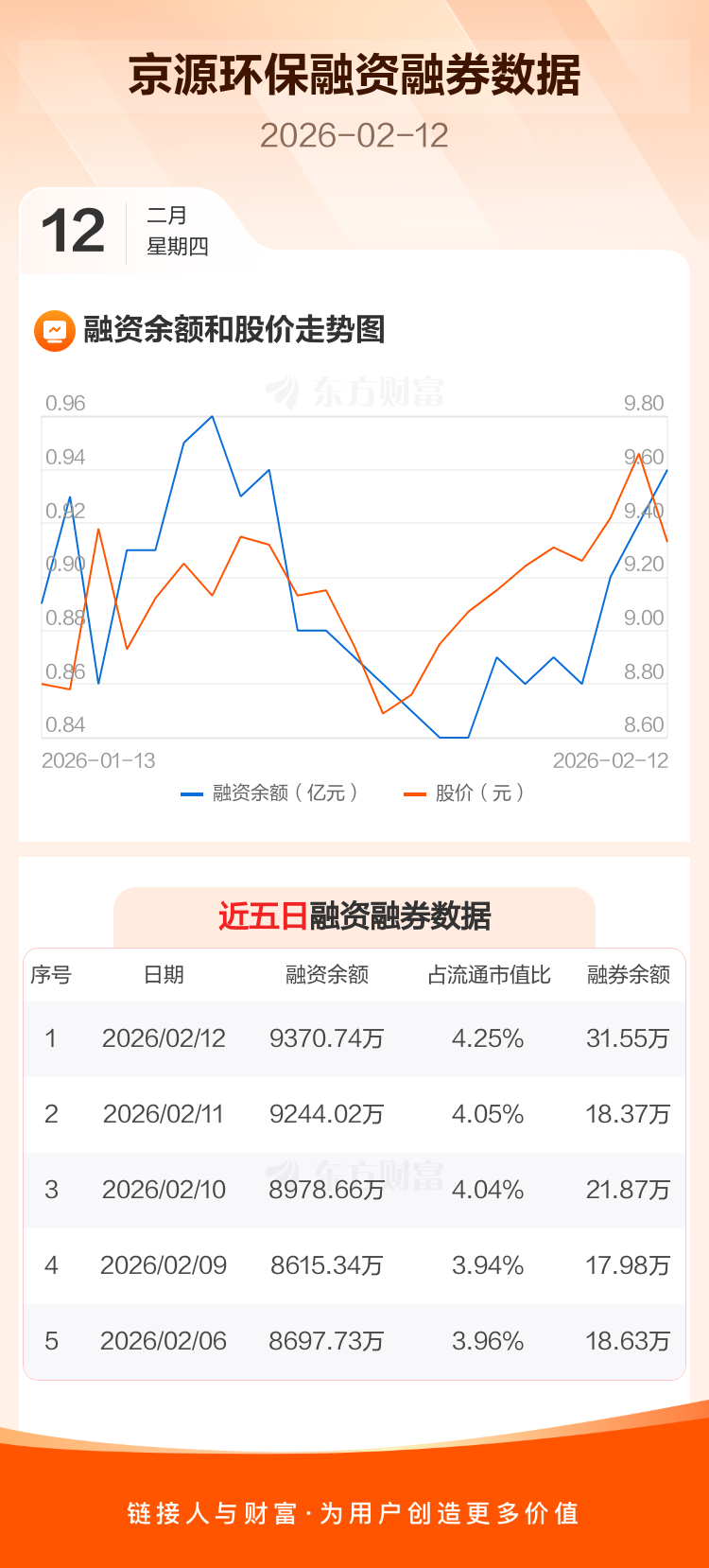 交易所最新数据显示,京源环保于2026年2月12日获融资买入566.42万元,融资偿还439.70万元,当日融资净买入126.72万元。目前,该股融资余额9370.74万,占流通市值比例为4.25%。