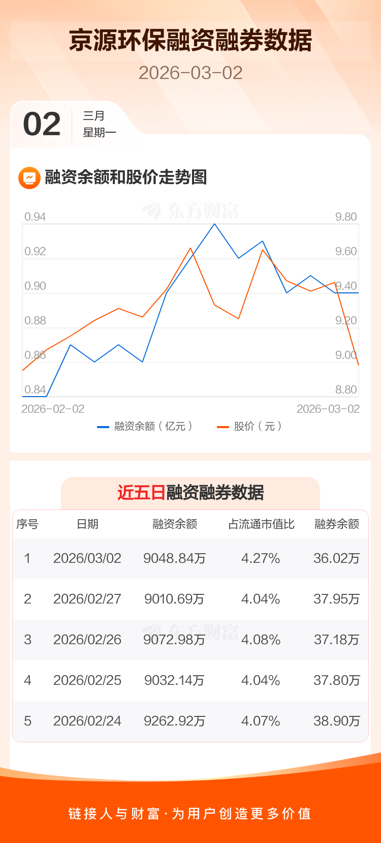 交易所最新数据显示,京源环保于2026年3月2日获融资买入620.43万元,融资偿还582.29万元,当日融资净买入38.15万元。目前,该股融资余额9048.84万,占流通市值比例为4.27%。