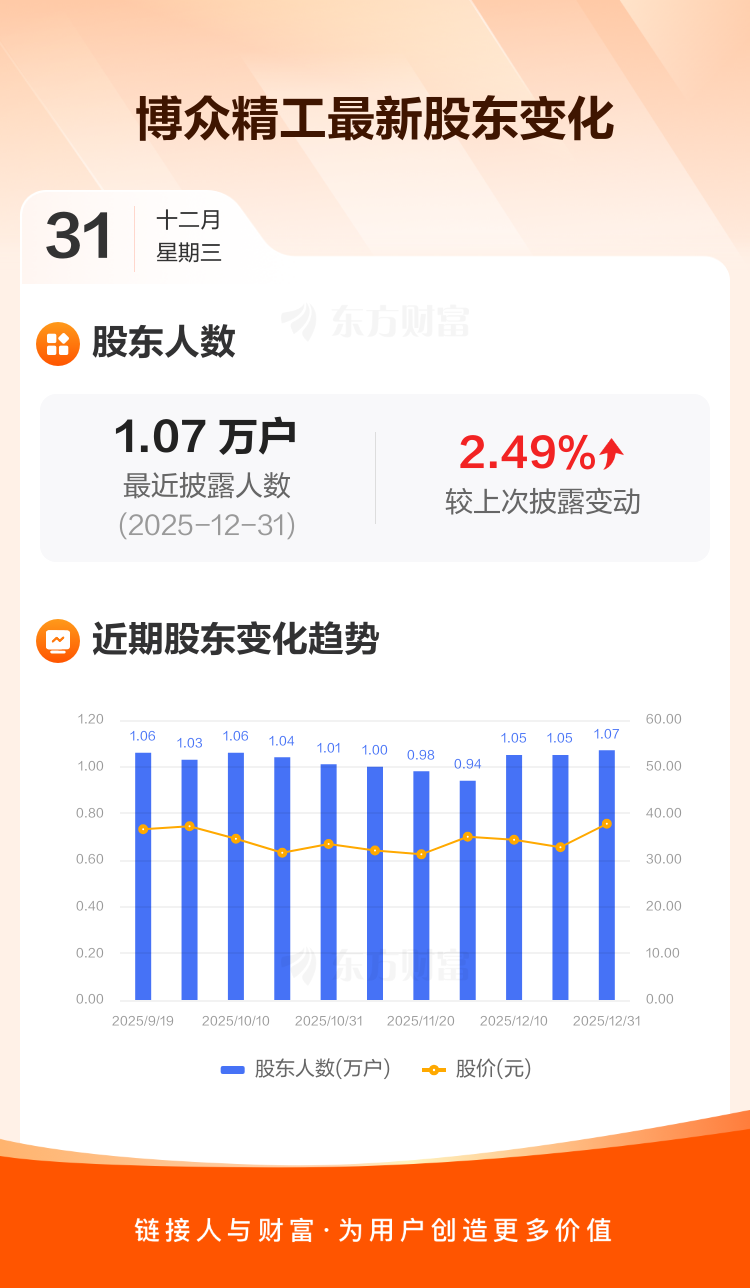 博众精工最新披露数据显示,截至12月31日公司股东户数为1.07万户,较上期(2025年12月19日)增加261户,增幅为2.49%。户均持有流通股数量由上期的4.24万股下降至4.14万股,户均持股金额由上期的138.96万元增加至156.33万元。