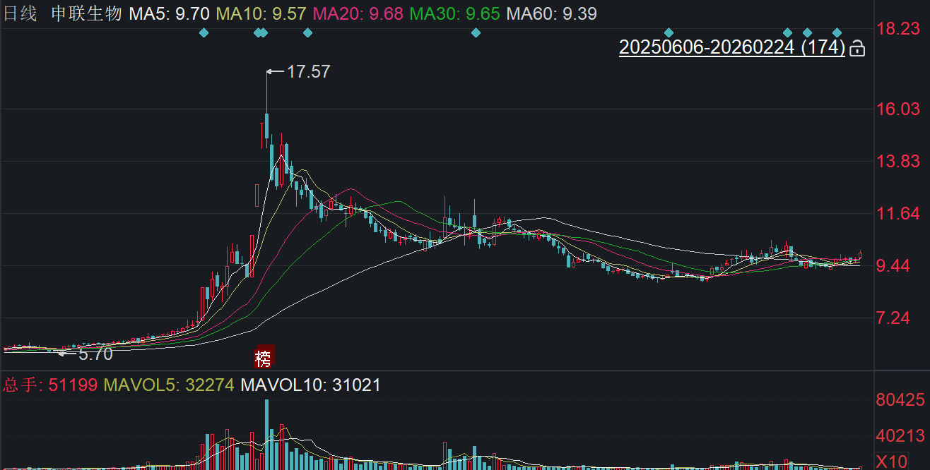 二级市场上,截至2月24日收盘,申联生物上涨2.90%报9.94元/股,总市值约40.82亿元,近一年以来累计上涨超七成。