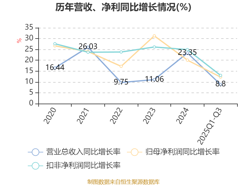 中证智能财讯威胜信息(688100)10月23日披露2025年第三季度报告。前三季度公司实现营业总收入21.12亿元,同比增长8.80%;归母净利润4.74亿元,同比增长12.24%;扣非净利润4.64亿元,同比增长13.02%;经营活动产生的现金流量净额为4.01亿元,同比增长1.95%;报告期内,威胜信息基本每股收益为0.97元,加权平均净资产收益率为14.26%。