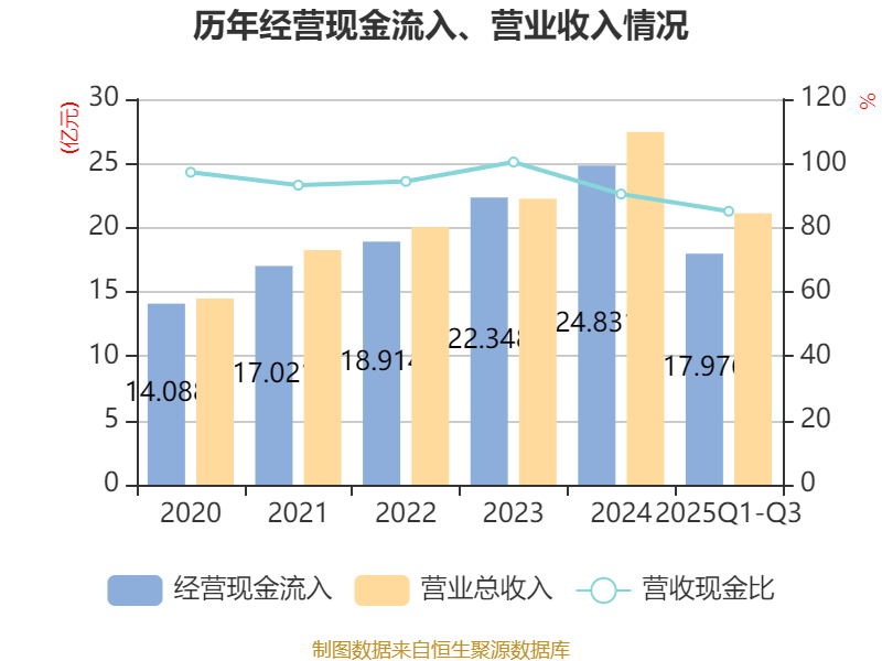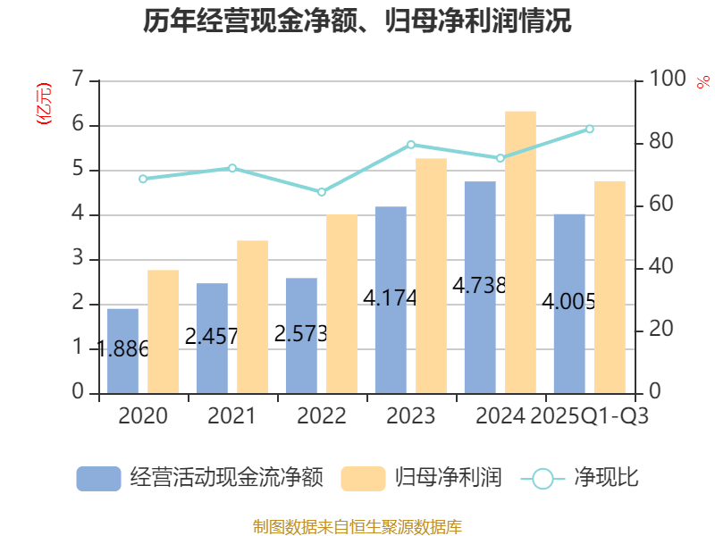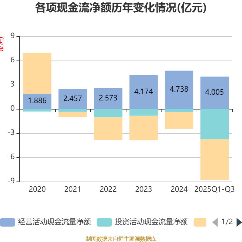 2025年前三季度,公司经营活动现金流净额为4.01亿元,同比增长1.95%;筹资活动现金流净额-5.02亿元,同比减少3.66亿元;投资活动现金流净额-3.78亿元,上年同期为-8.03亿元。