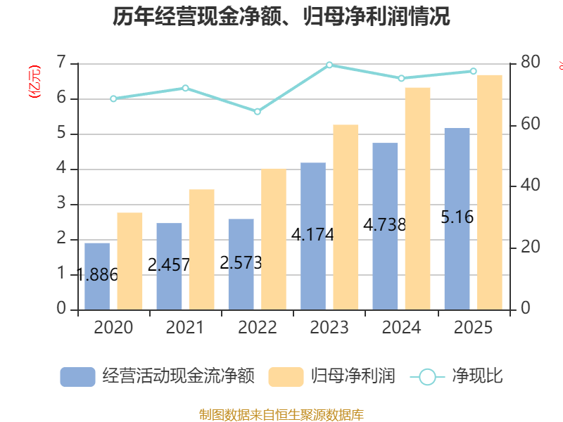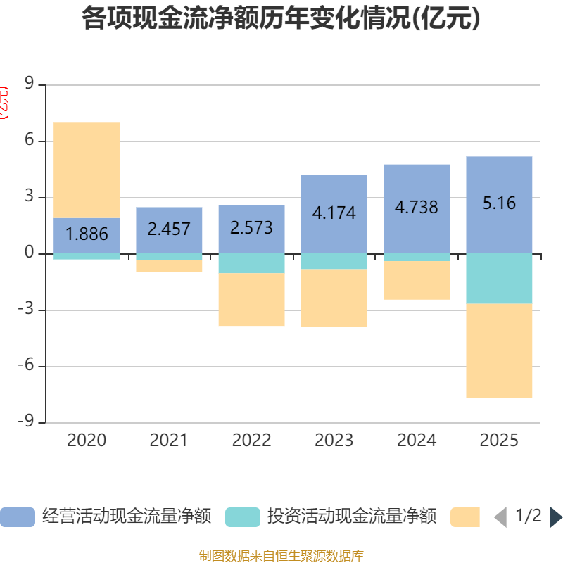 截至2025年,公司经营活动现金流净额为5.16亿元,同比增长8.91%;筹资活动现金流净额-5.03亿元,同比减少2.97亿元;投资活动现金流净额-2.69亿元,上年同期为-4144.1万元。