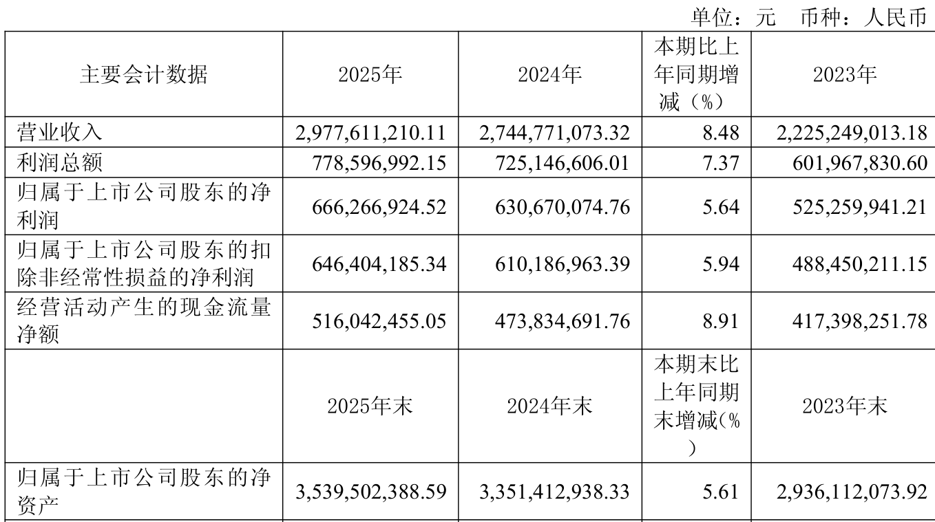 中证智能财讯威胜信息(688100)2月28日披露2025年年度报告。2025年,公司实现营业总收入29.78亿元,同比增长8.48%;归母净利润6.66亿元,同比增长5.64%;扣非净利润6.46亿元,同比增长5.94%;经营活动产生的现金流量净额为5.16亿元,同比增长8.91%;报告期内,威胜信息基本每股收益为1.36元,加权平均净资产收益率为19.71%。公司2025年度分配预案为:拟向全体股东每10股派现3元(含税)。