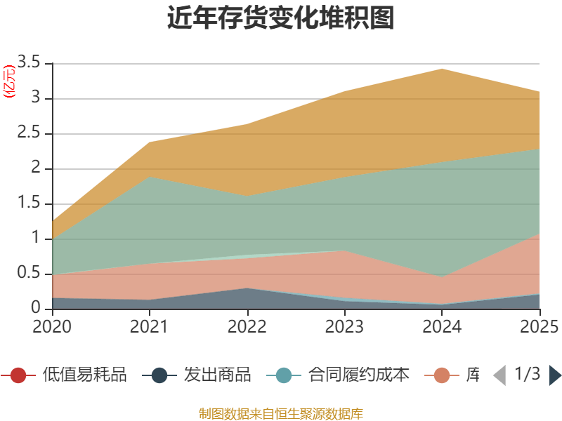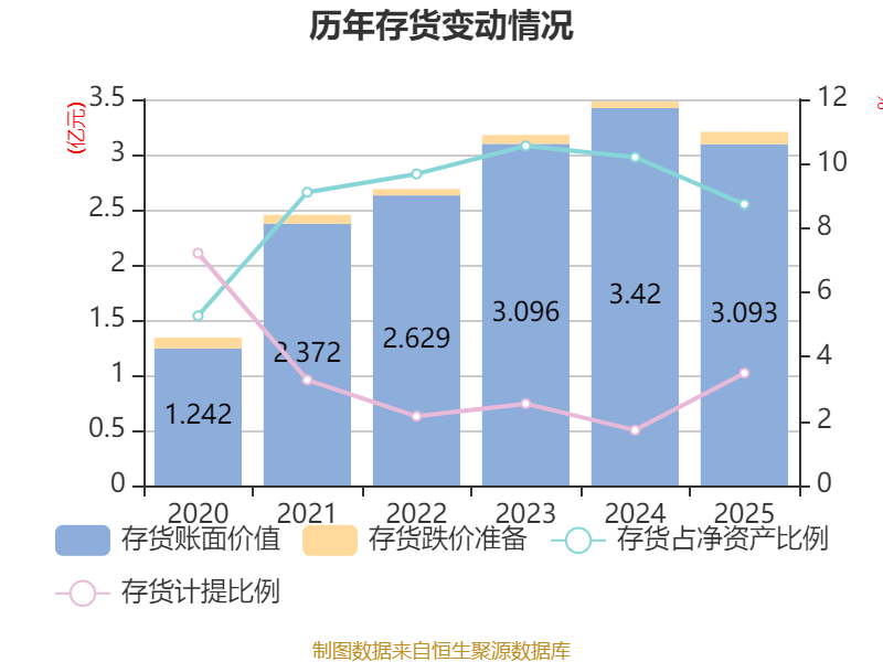 从存货变动来看,截至2025年末,公司存货账面价值为3.09亿元,占净资产的8.74%,较上年末减少3268.61万元。其中,存货跌价准备为1117.14万元,计提比例为3.49%。