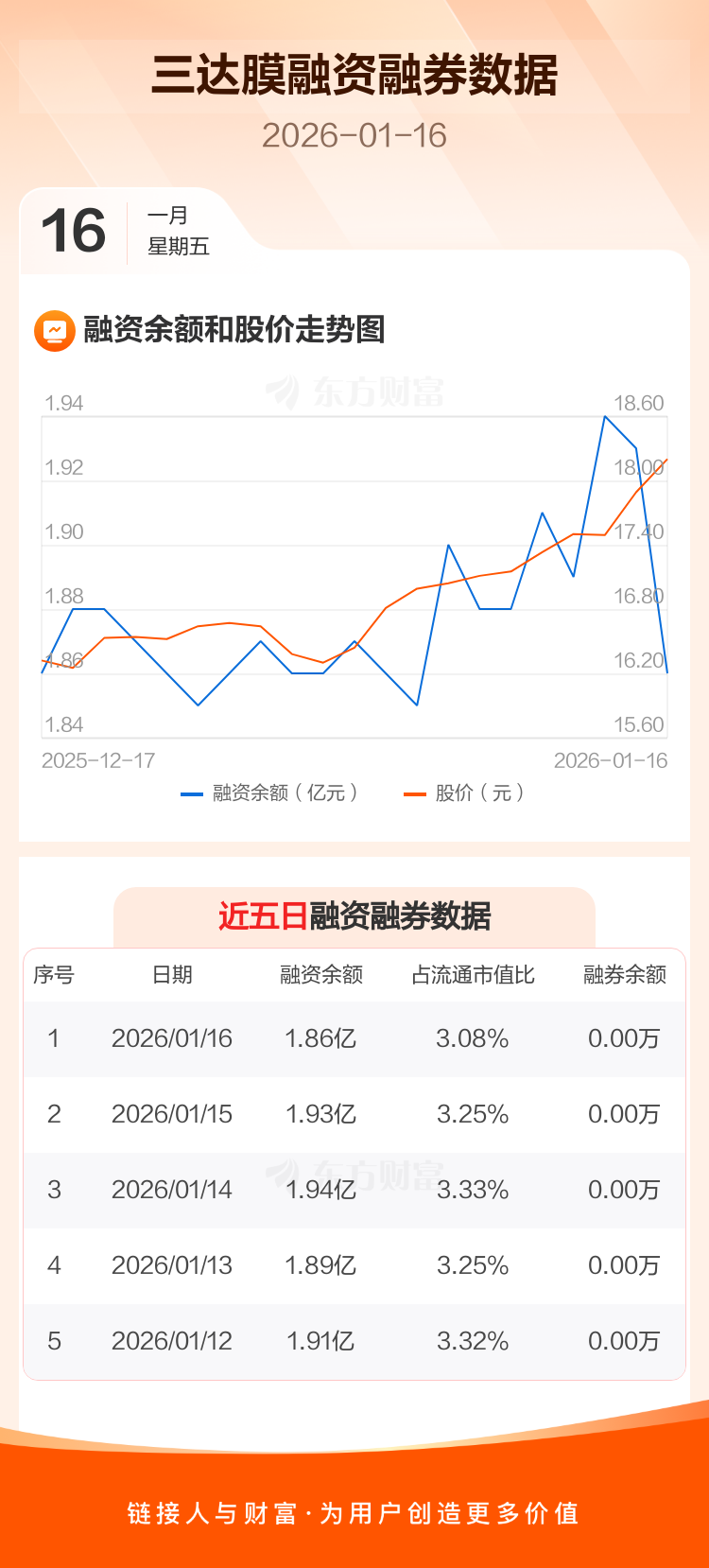 交易所最新数据显示,三达膜于2026年1月16日获融资买入906.86万元,融资偿还1574.80万元,当日融资净偿还667.94万元。目前,该股融资余额1.86亿,占流通市值比例为3.08%。