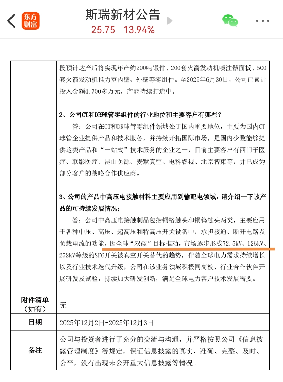 这是TOP2来助攻?昨天机构调研时斯瑞说:高压电触头产品受益于节能降碳过程中的替